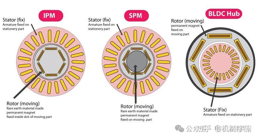 与 IPM 电机一样,SPM 也是同步电机,但这里的永磁电机安装在转子表面上,而电枢固定在定子上。在 SPM 中,磁阻转矩最小,因此产生的转矩小于 IPM 电机。